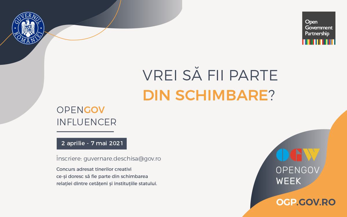 Guvernul României organizează concursul OpenGov Influencer, în scopul creșterii gradului de informare și implicare a tinerilor cu privire la valorile și principiile guvernării deschise, prin încurajarea utilizării noilor tehnologii digitale pentru promovarea acestora.